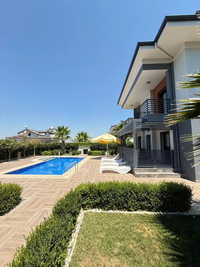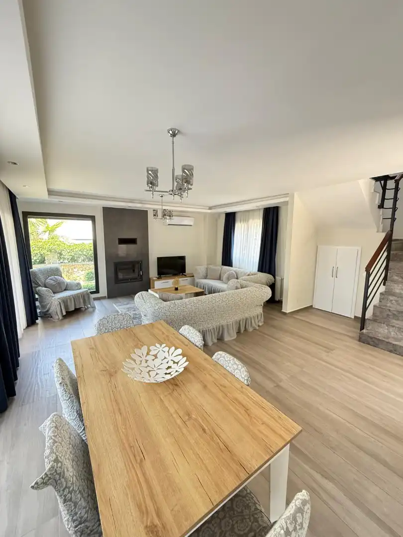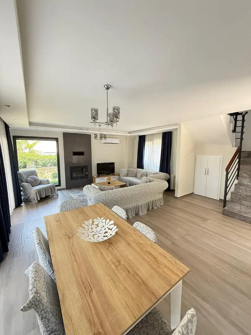 Salon: Özenle döşenmiş salon, modern koltuklar, 8 kişilik yemek masası, Lcd tv, uydu alıcısı ve klima bulunmaktadır. Havuz ve bahçeye çıkış kapısı yer almaktadır.